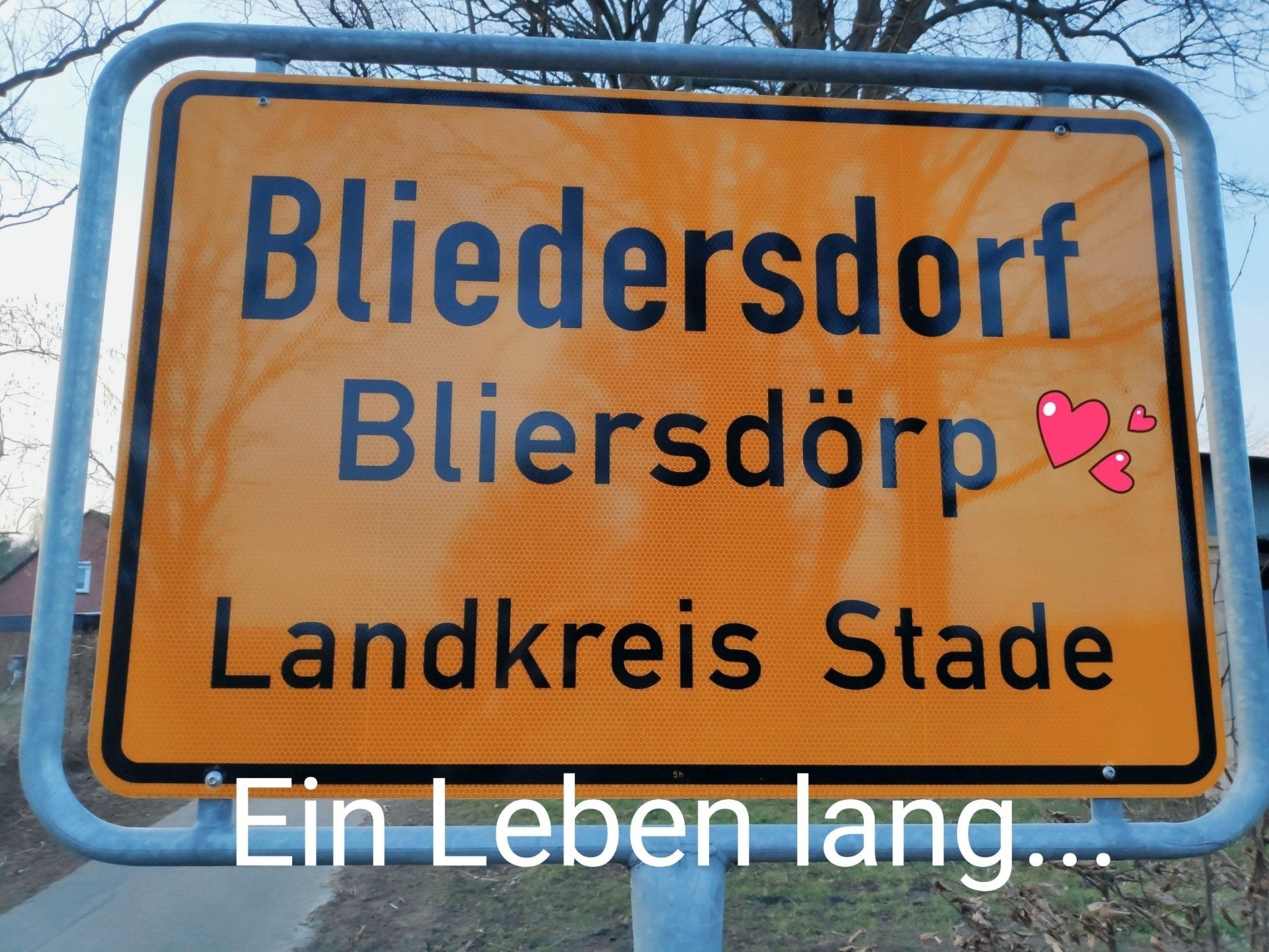Ortsschild der Gemeinde Bliedersdorf in der Samtgemeinde Horneburg im Landkreis Stade. Ein SPDler entwarf den Slogen: "Bliedersdorf......ein Leben lang!" Das spricht für sich!