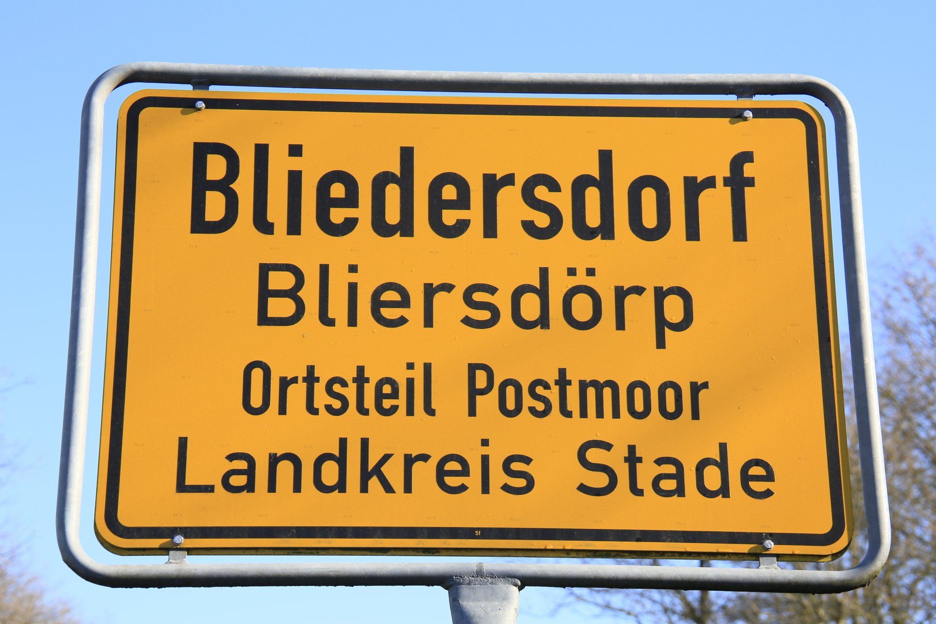 Ortsschild der Gemeinde Bliedersdorf in der Samtgemeinde Horneburg im Landkreis Stade. Ein SPDler entwarf den Slogen: "Bliedersdorf......ein Leben lang!" Das spricht für sich!